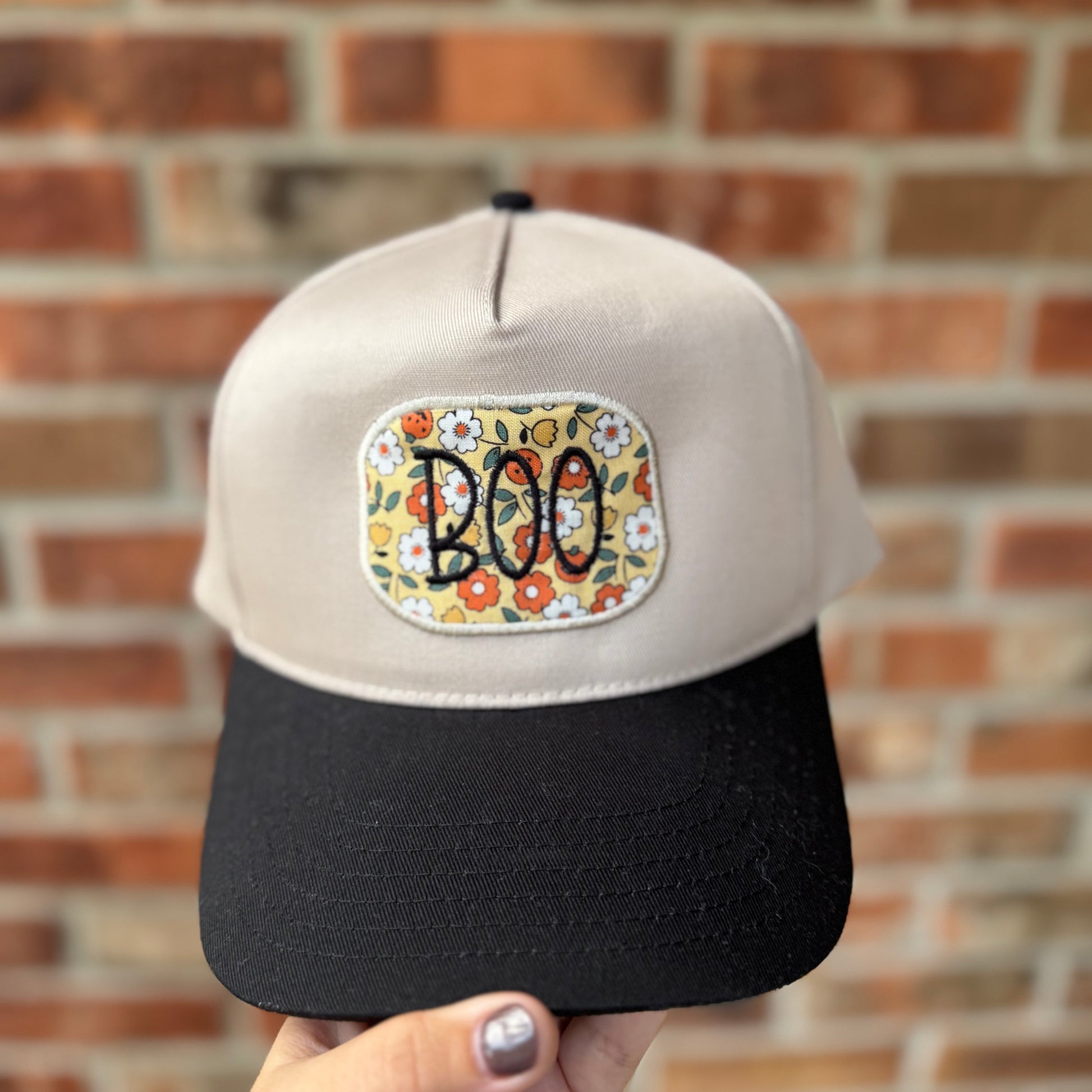 A playful mix of spooky and sweet! ๐ This BOO embroidered patch hat features bold black lettering over a retro floral background, making it the perfect accessory for fall. With a neutral tan crown, black bill, and a comfortable fit, itโs easy to style for pumpkin patches, trick-or-treating, or everyday wear.